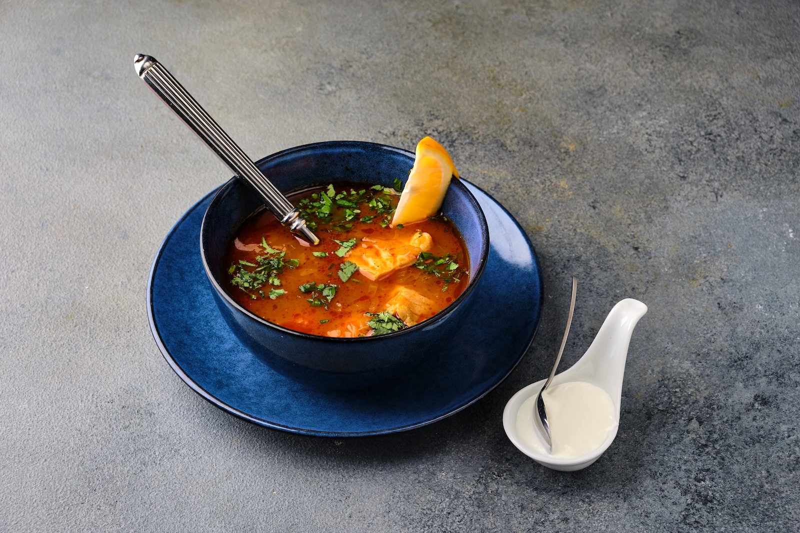 Лосось, форель, огурцы соленые, маслины, лук, лимон, сметана, зелень